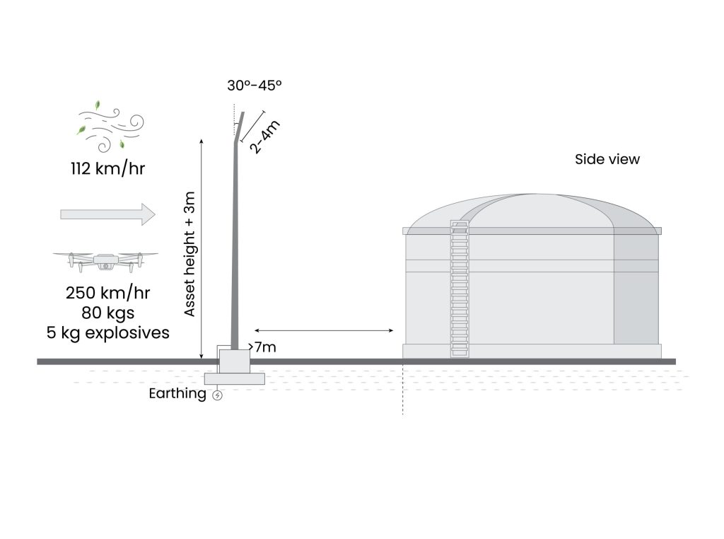 Poles extend 3 meters above the protected asset and 3 meters inward at an angle, featuring a polygonal tapering shape with a structurally calculated foundation for enhanced resilience.