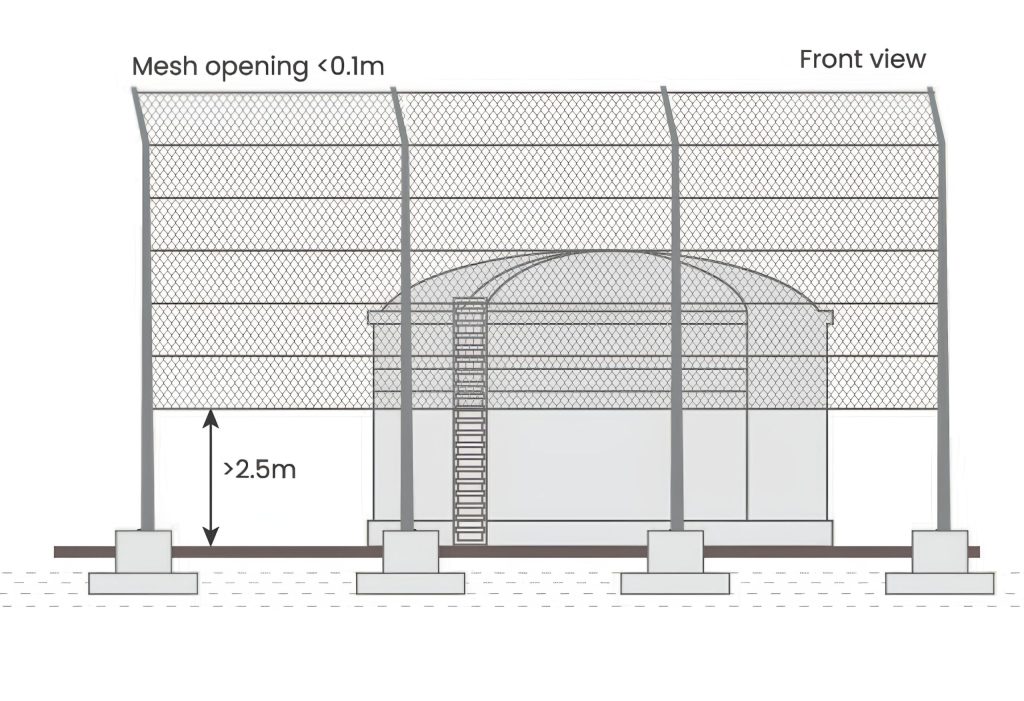 The mesh starts at 2.5 meters above ground for easy maintenance access, while external guide wires ensure any structural failure directs the fence outward, away from the asset.